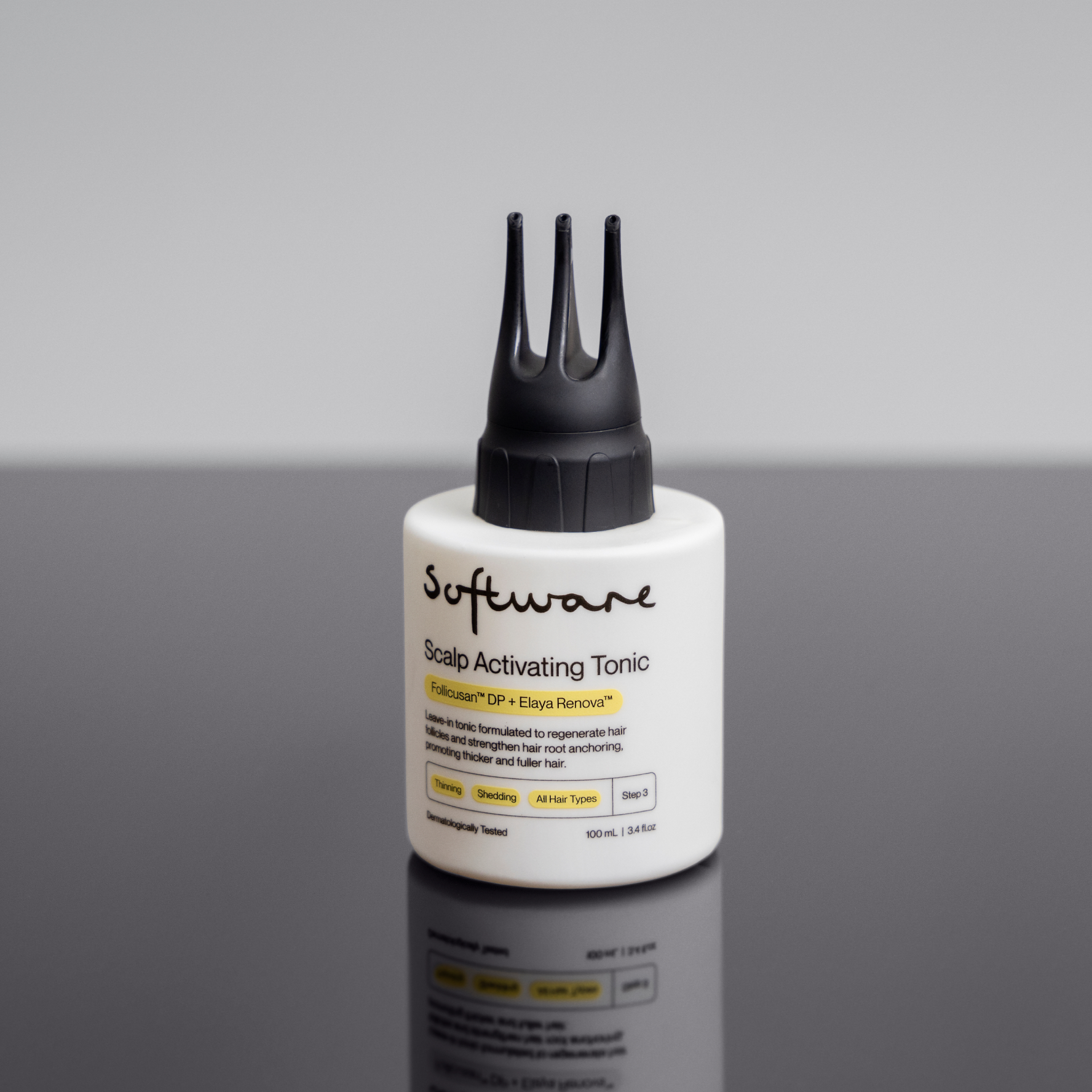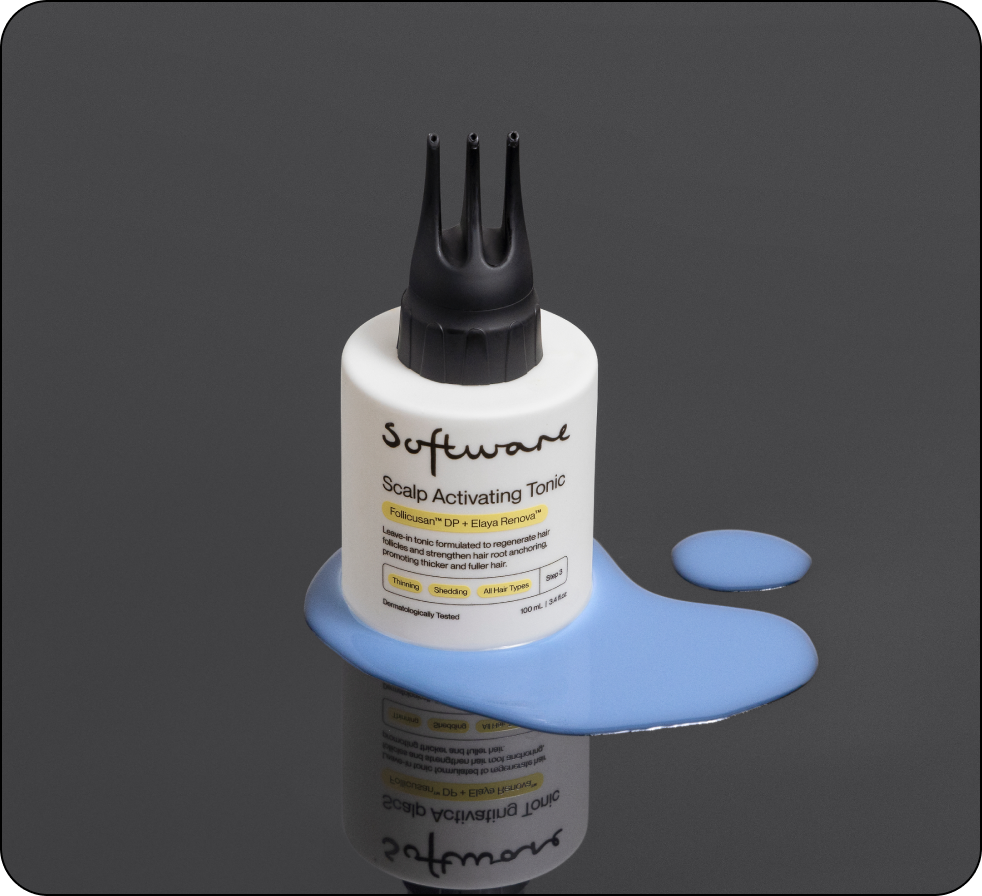 Our Scalp Activating Tonic is designed to strengthen hair anchoring to help address hair loss and damage at the roots, instead of just addressing symptoms of damaged hair such as dryness and breakage. It contains ingredients like Follicusan DP and Elaya Renova to strengthen hair at the base of the shaft, and ProRenew Complex to balance the scalp microbiome.